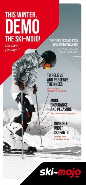 Ski-Mojo, a mechanical exoskeleton for skiing and snowboarding, transfers roughly one-third of the skier’s bodyweight from the pelvis to the ground. This means 15 to 40 kg less load borne by the legs. Powered by strong springs, it also absorbs shocks and vibrations travelling up the legs. Finally, by improving ski–snow contact, it enhances ski bending for more controlled turns. Learn more about the Ski-Mojo technology by following this link.